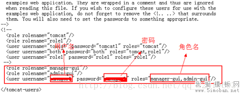 在conf目录下的tomcat-users.xml文件里面,用记事本打开这个文件;找到下面这个位置,加上这几句代码: