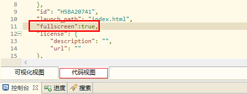 双击应用的manifest.json文件,切换到“代码视图”,在根节点下添加fullscreen节点:**