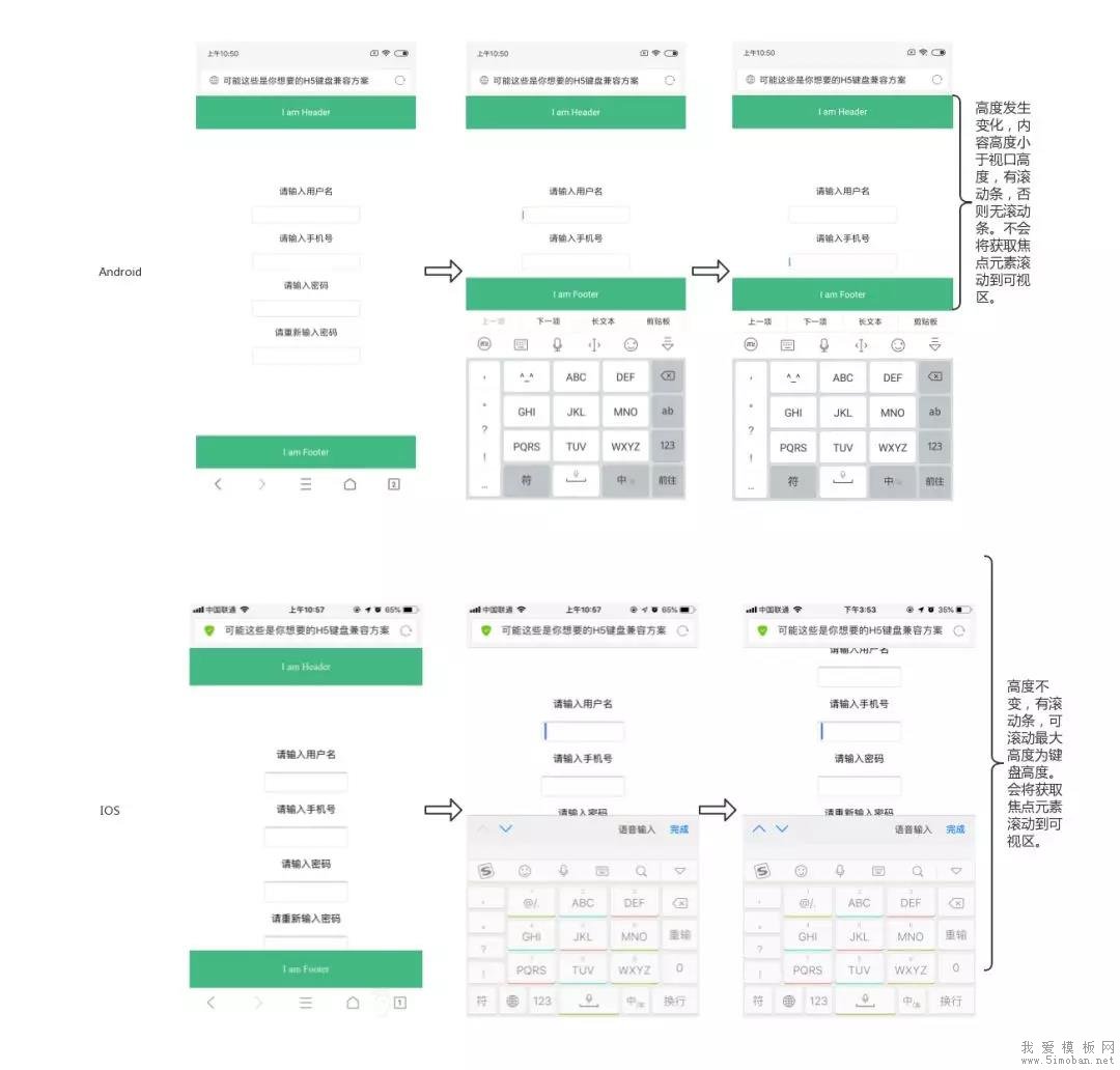 弹起软键盘始终让输入框滚动到可视区有时我们会做一个输入表单,有很多输入项,输入框获取焦点,弹起软键盘。当输入框位于页面下部位置时,在 IOS 上,会将 webview 整体往上滚一段距离,使得该获取焦点的输入框自动处于可视区,而在 Android 则不会这样,它只会改变页面高度,而不会去滚动到当前焦点元素到可视区。