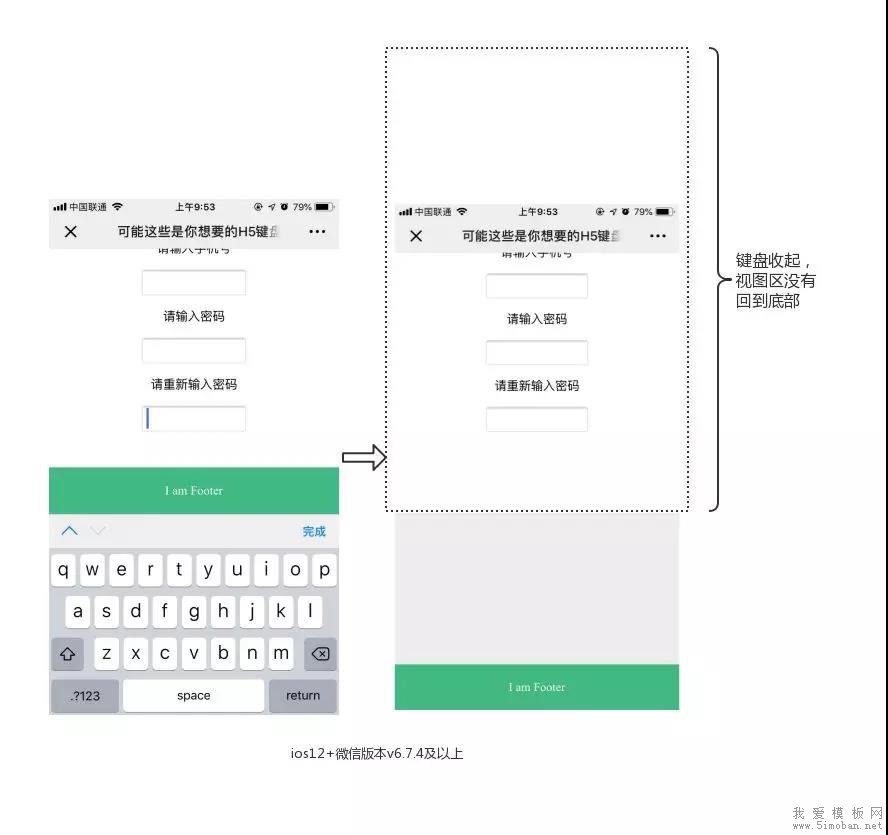如果你在用 IOS12 和 V6.7.4+版本的微信浏览器打开上面表单输入的 demo ,就会惊奇的发现键盘收起后,原本被滚动顶起的页面并没有回到底部位置,导致原来键盘弹起的位置“空”了。
