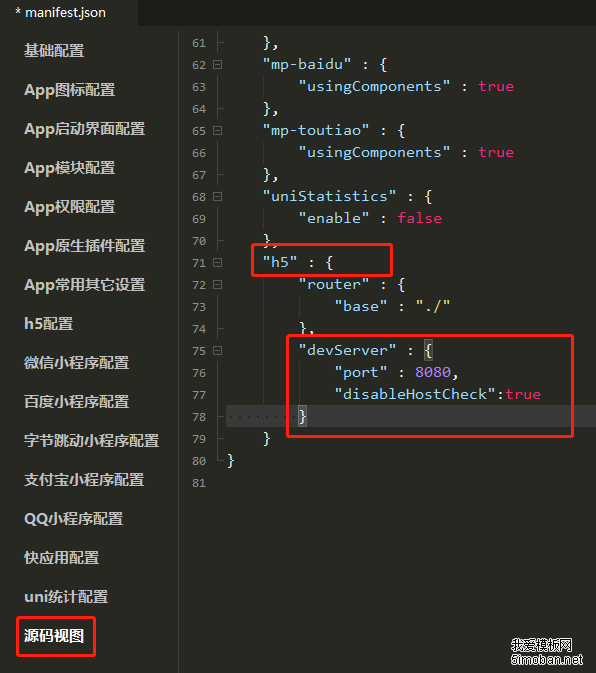 manifest.json设置h5配置里devServer里的disableHostCheck为true即可,代码如下: