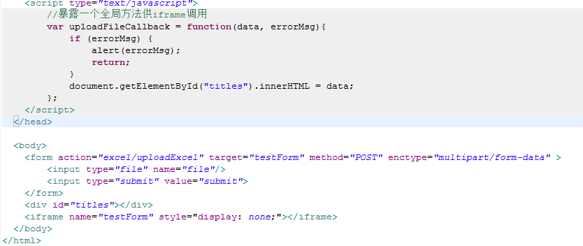 所以基本思路很简单,提交上传文件表单时,让浏览器转移到iframe处理响应信息,响应信息嵌入一段js代码,这段js代码调用当前页面的一个方法就可以实现回调,类似于xss攻击。