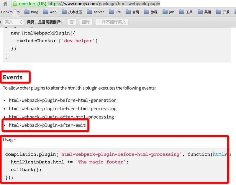 我们可以看到,html-webpack-plugin 这个插件的确提供了几个可选的事件,下面也提供了使用方法,这样,我们就能够监听到html文件的变化,然后我们使用下面的代码发布一个事件: