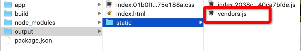 上面代码的意思是,我们把Vue.js当做公共模块单独打包,你可以在这个数组中增加其他模块,一起作为公共模块打包成一个文件,我们执行构建命令,然后查看输出,如下图,成功提取: