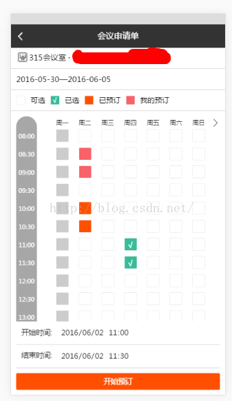 最近小编在做一个会议室预定的功能,这个功能就像在买电影票时选择座位一样,看看会议室的哪个时间段空闲,有什么设备等等。由于我做的是APP,APP既要兼容Android,又要兼容IOS,刚开始的开发与调试我都是用谷歌浏览器干的,我没有用其它浏览器进行测试,谁知道最后遗留一个很大的隐患。下面是我的界面。