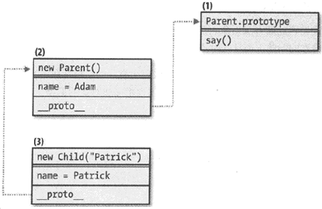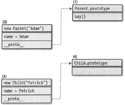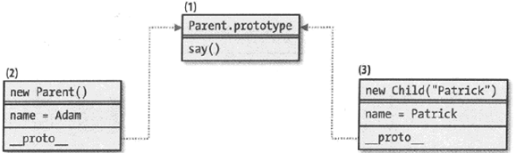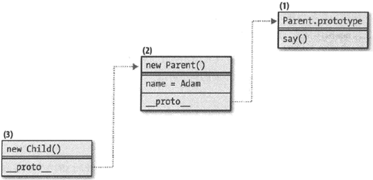 结果看出Child的参数顺利传入了,但say方法会报未定义的错。原因就是该模式并没有将prototype指向Parent,只不过借用了一下Parent的实现。因此看似是继承,其实不然,从原型链角度来看,两者毫无关系。Child的实例对象里自然就没有Parent原型中的say方法。图示如下: