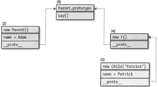 为解决模式四中父子对象间耦合度较高的缺点,该模式断开父子对象间的原型的直接链接关系,但同时还能继续受益于原型链的好处
