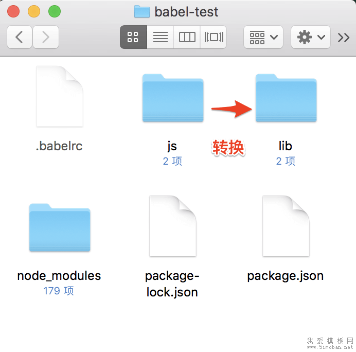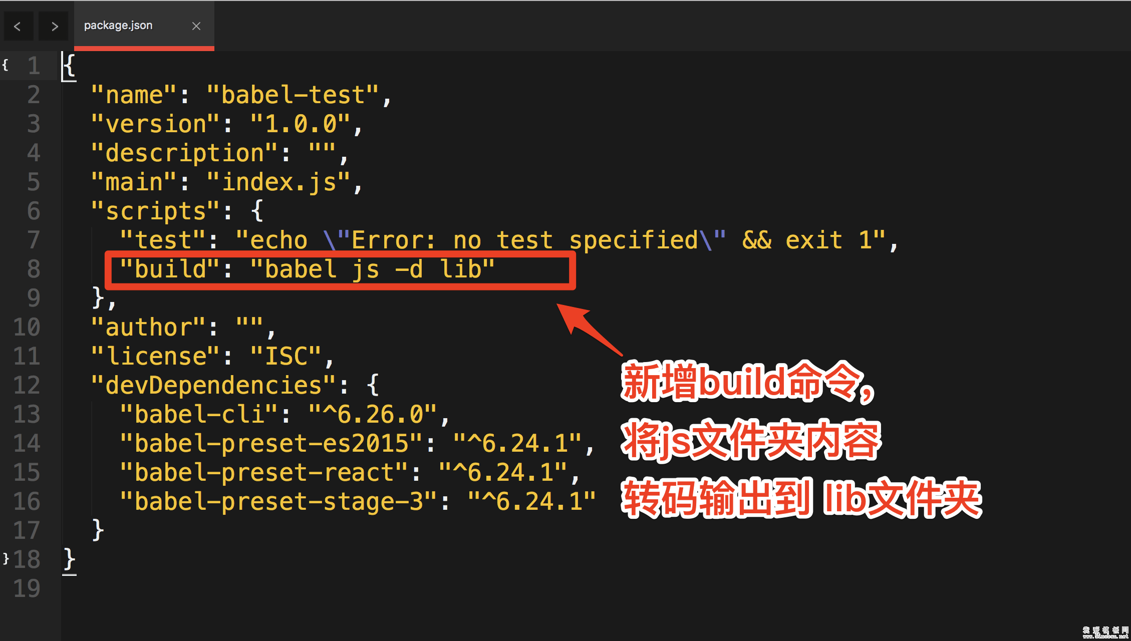 npm install --save-dev babel-cli在package.json 中配置运行命令build(命令作用为: 把根目录下的js文件夹内所有es6语法的js文件, 在保持原文件名的基础上, 转码输出到lib文件夹)