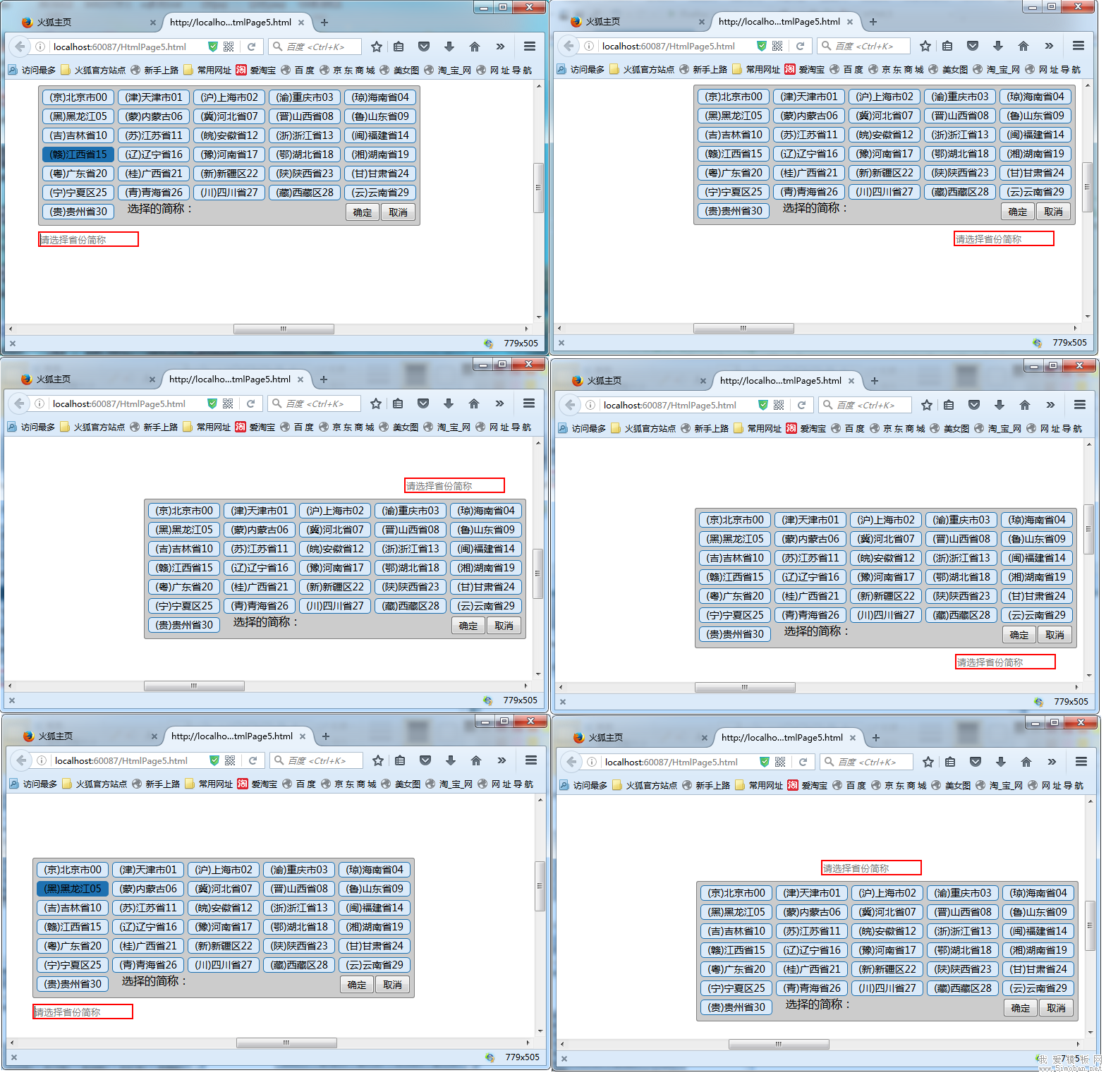 $('body').append('<div id="province" style="position:absolute;border:1px solid #808080;width:540px;height:197px;border-radius: 3px;background-color:#ccc;display:block;"><div class="c" v="京">(京)北京市00</div><div class="c" v="津">(津)天津市01</div><div class="c" v="沪">(沪)上海市02</div><div class="c" v="渝">(渝)重庆市03</div><div class="c" v="琼">(琼)海南省04</div><div class="c" v="黑">(黑)黑龙江05</div><div class="c" v="蒙">(蒙)内蒙古06</div><div class="c" v="冀">(冀)河北省07</div><div class="c" v="晋">(晋)山西省08</div><div class="c" v="鲁">(鲁)山东省09</div><div class="c" v="吉">(吉)吉林省10</div><div class="c" v="苏">(苏)江苏省11</div><div class="c" v="皖">(皖)安徽省12</div><div class="c" v="浙">(浙)浙江省13</div><div class="c" v="闽">(闽)福建省14</div><div class="c" v="赣">(赣)江西省15</div><div class="c" v="辽">(辽)辽宁省16</div><div class="c" v="豫">(豫)河南省17</div><div class="c" v="鄂">(鄂)湖北省18</div><div class="c" v="湘">(湘)湖南省19</div><div class="c" v="粤">(粤)广东省20</div><div class="c" v="桂">(桂)广西省21</div><div class="c" v="新">(新)新疆区22</div><div class="c" v="陕">(陕)陕西省23</div><div class="c" v="甘">(甘)甘肃省24</div><div class="c" v="宁">(宁)宁夏区25</div><div class="c" v="青">(青)青海省26</div><div class="c" v="川">(川)四川省27</div><div class="c" v="藏">(藏)西藏区28</div><div class="c" v="云">(云)云南省29</div><div class="c" v="贵">(贵)贵州省30</div><div style="float:left;"> 选择的简称:<span id="simple" style="color:red;font-weight:bolder;"></span></div><div style="position:absolute;right:5px;bottom:5px;display:inline;"><input id="Kconfirm" type="button" name="name" value="确定" /><input id="Kcancel" type="button" name="name" value="取消" /></div></div>');