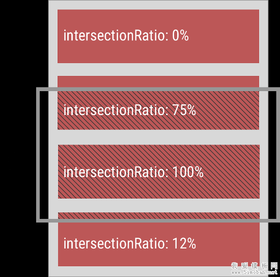上图中,灰色的水平方框代表视口,深红色的区域代表四个被观察的目标元素。它们各自的intersectionRatio图中都已经注明。