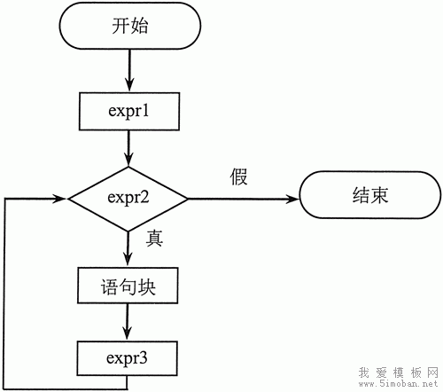 表达式 expr1 在循环开始前无条件地求值一次,而表达式 expr2 在每次循环开始前求值。如果表达式 expr2 的值为真,则执行循环语句,否则将终止循环,执行下面代码。表达式 expr3 在每次循环之后被求值。for 循环语句的流程控制示意如图所示。