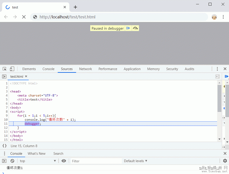下面代码使用 debugger 语句中止执行 for 循环的每一次迭代。现在谷歌浏览器中开启调试工具,演示效果如图所示。