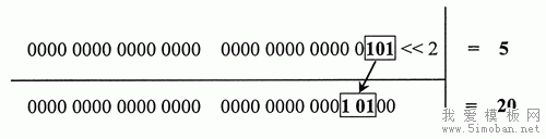 “<<”运算符执行左移位运算。在移位运算过程中,符号位始终保持不变。如果右侧空出位置,则自动填充为 0;超出 32 位的值,则自动丢弃。把数字 5 向左移动 2 位,则返回值为 20。