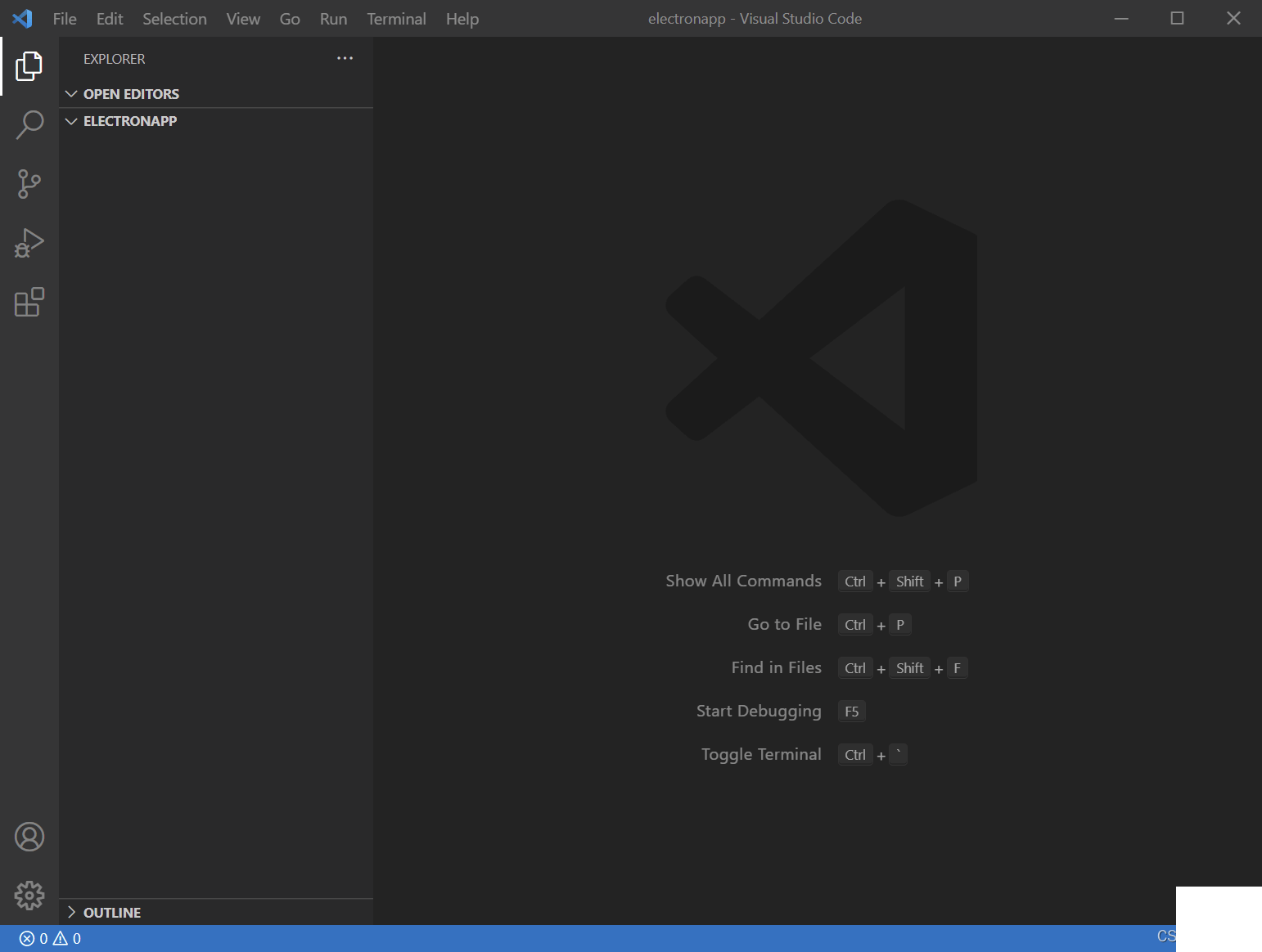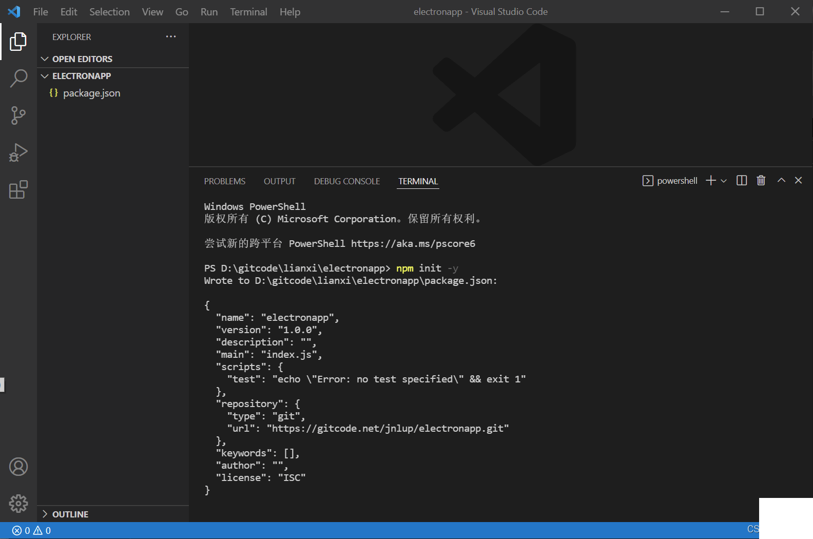 1.在电脑上新建一个名为electronapp的文件夹,然后在Code中打开此文件夹。