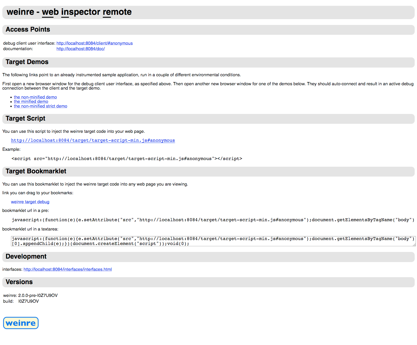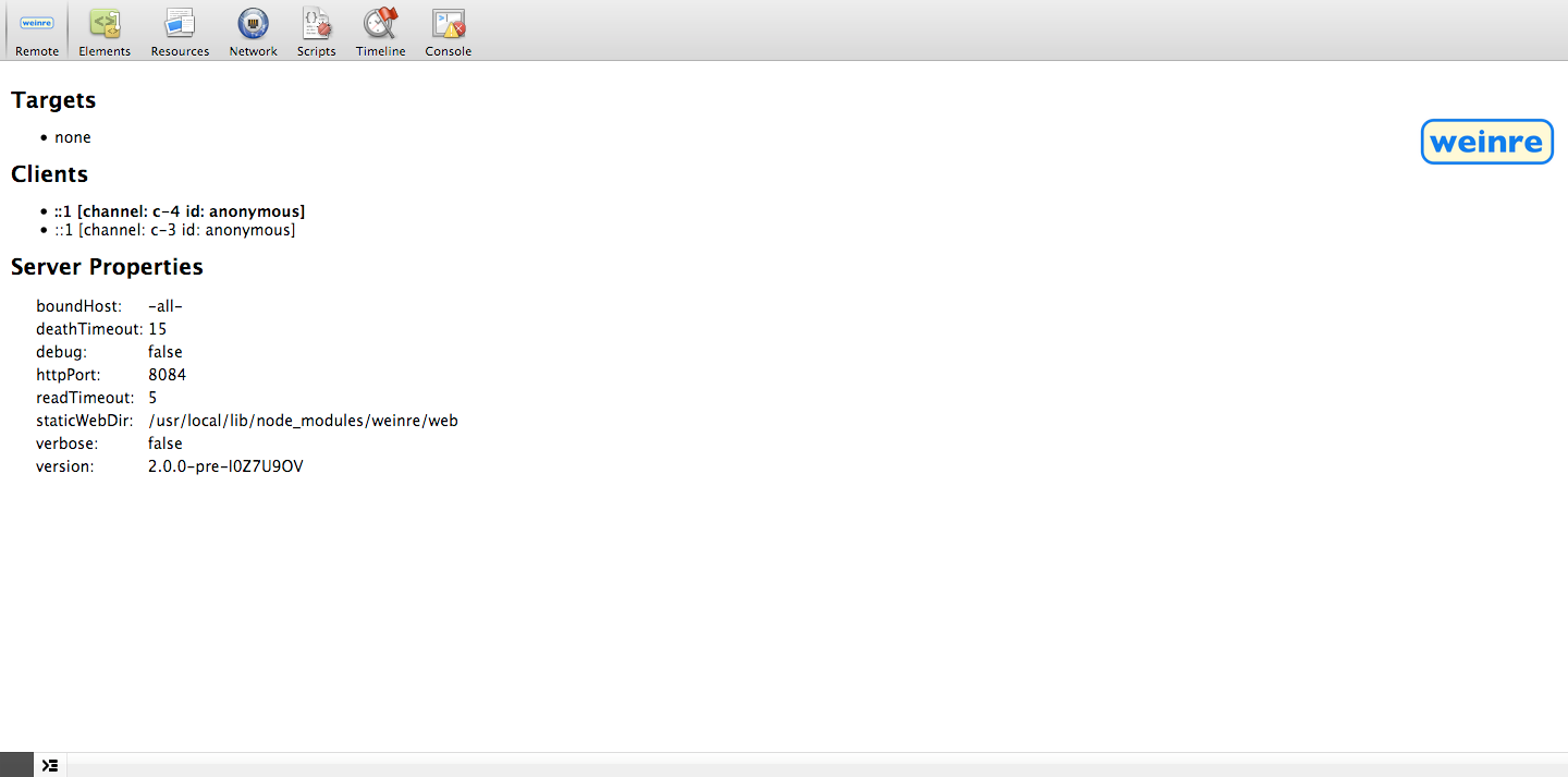 ,我默认的端口是8080的,但是我已经有别的程序在使用了,所以我把weinre的端口设置成了8084。