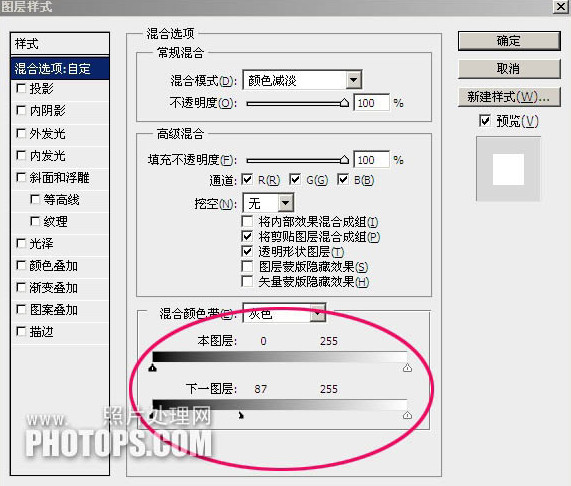 4、双击图层弹出图层样式对话框,对混合选项进行设置,在底部位置,按住AIT拖移右半块到适当的位置。