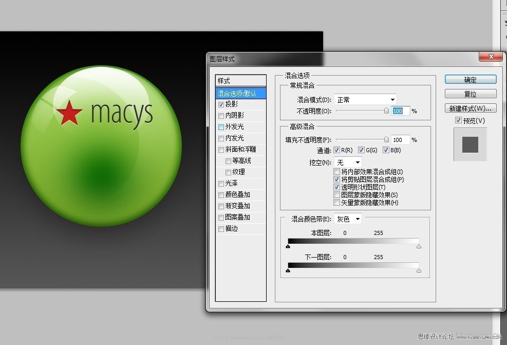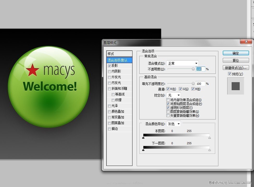 第二步、使用椭圆工具画一个正圆, 并添加如下图层样式: