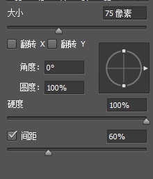 而在第二幅图中,因为笔刷间距为60,所以只有部分叠加了,所以有部分的颜色明显加深了。