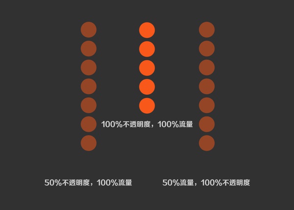 中间是百分百的不透明度和百分百的流量,左边是流量不变,不透明度减半,右边是不透明度不变,流量减半。