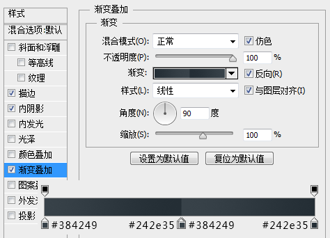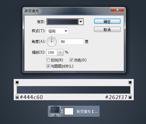 我们首先进行背景的创建,我创建了一个“渐变”调整层,设置的#444c60到#262f37的90度的径向渐变。
