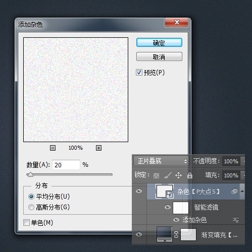 建个新图层,填充白色,执行“滤镜—杂色—添加杂色”,设置杂色数量为20%,平均分布,并将这个图层混合模式更改为“正片叠底”。