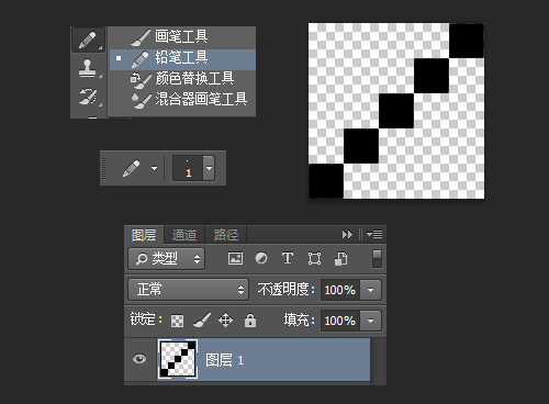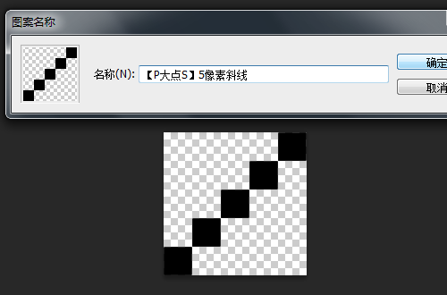 下面,我们制作原图中的像素斜线,新建个5像素*5像素的文档,放大画布到最大,用铅笔工具,设置铅笔像素大小为1像素,画出如下图案,记得把文档的背景图层删除掉,我们只要那个斜线图层。