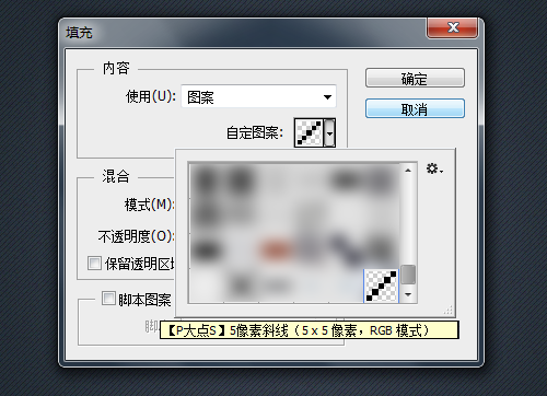 回到我们的文档,在“杂色”图层上层,新建个图层,执行“编辑—填充”,选择使用图案填充,找到刚才我们自定义的那个图案,确定。