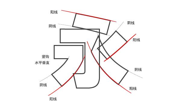 咋一看好像很玄乎的说法,阴阳线。其实理解起来也很简单,字体有重量的,所以分粗细,单个笔画的2侧就是阴阳线。结合单个字体来看,字体每一笔画外围向阳(凸线的笔画比较容易懂,上图红色部分),即为阳线,内阴(凹线笔画上图红色对应的笔画)则为阴线。