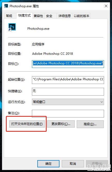 1、对着ps的桌面快捷方式右键->属性->快捷方式->打开文件所在位置,打开安装目录:
