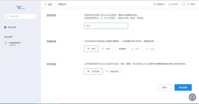 然后填写空间名称(即bucket,后面会用到这个名称),访问控制为公开(选择公开访问是为了操作方便,当然你也可以选择私有,不过请求资源时候需要授权),确认创建。