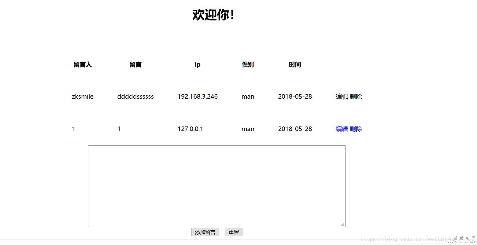 1、首先是留言界面,包括添加新留言、对留言进行编辑和删除、登录和退出登陆。先看下效果图