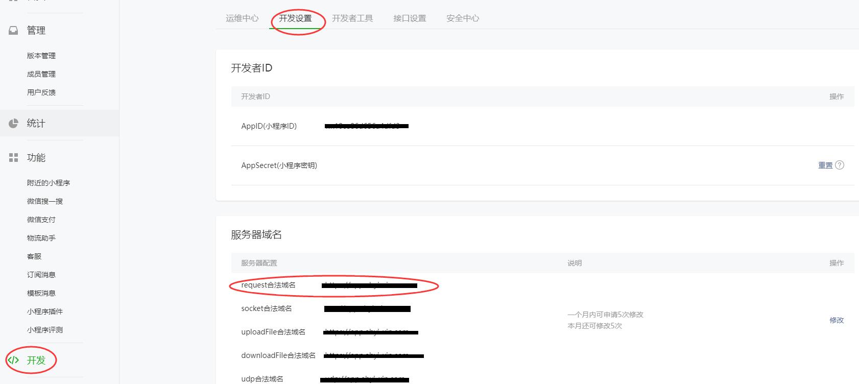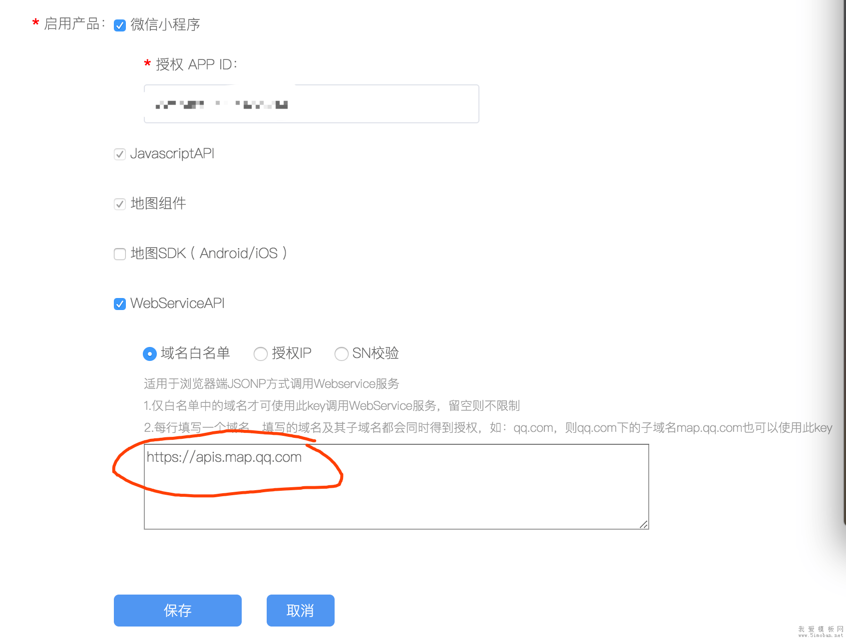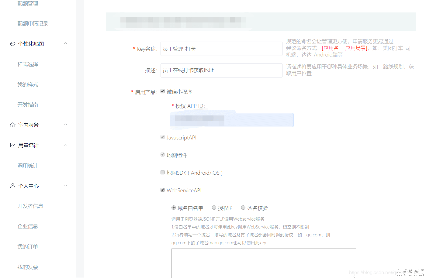 即:“请求来源未被授权, 此次请求来源域名:servicewechat.com”,这时,在小程序中获取定位具体信息时,不要配置腾讯地图中的WebServiceAPI中的域名白名单什么的,域名配置直接在小程序后台中配置(https://apis.map.qq.com),