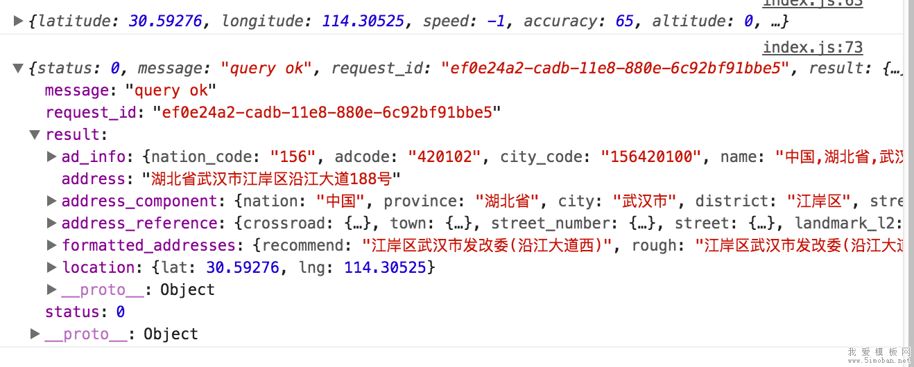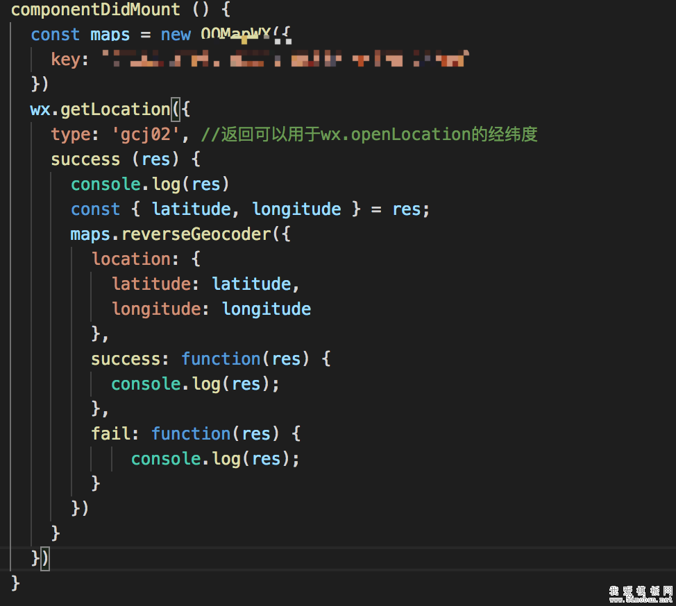 第二步:通过小程序官方API获取用户当前位置经纬度。然后再根据腾讯Webservice API逆地址解析相关介绍,传入获取到的经纬度,以及key值,即可获取。