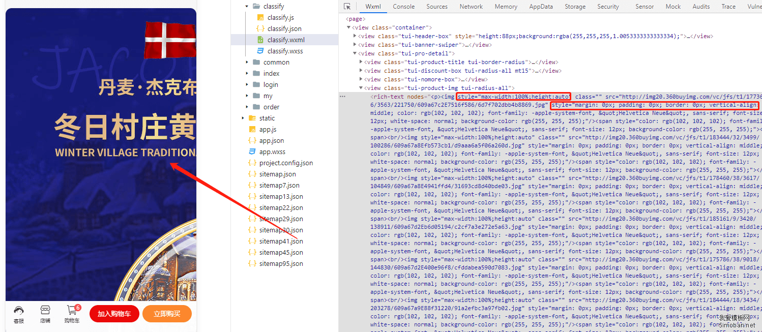 今天,我爱模板网在开发一款小程序的产品详情时,又使用了这种方法,但是在小程序上发现,有些正常显示了,有些不正常。正常显示的都是后台上传图片的,不正常显示的都是从京东、淘宝复制过来的产品详情。分析了下替换后的代码,发现都有: