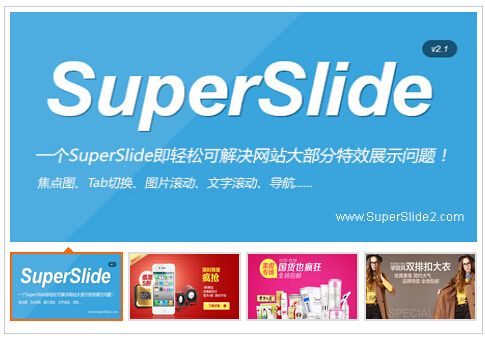 只需要引入一个jQuery.js,一个SuperSlide.js,修改下调用参数,你就可以实现jQuery幻灯片,jQuery Tab切换,jQuery图片滚动,jQuery无缝滚动,jQuery文字滚动等等。