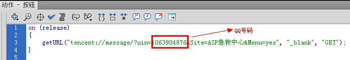 5、一次选中场景中四个按钮,按F9打开动作面板,修改里面的QQ号为您的QQ号码,最后,ctrl+enter发布影片。