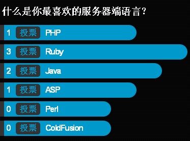 jQuery蓝色带动画效果的投票插件:什么是你最喜欢的服务器端语言。由于该插件使用了css3的圆角效果“border-radius”,所以在IE8以上浏览器显示不如谷歌和火狐等支持cs3的浏览器效果好。兼容主流浏览器。