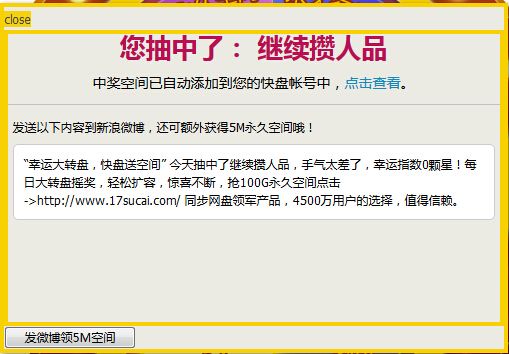 <div id="top-menu-wrapper" class="dn bgfix"> <div id="top-menu"> <div class="l"> <a class="user bgfix" href="http://www.17sucai.com"> </a> <span>(今天还有</span><span class="lottery-times">0</span> <span>次抽奖机会)</span> </div> <a class="logout r" href="http://www.17sucai.com">退出</a> </div> </div> <div id="header"> <div id="turnplatewrapper" onselectstart="return false;" class="bgfix"> <div id="turnplate" class="bgfix"> <div id="awards" class="bgfix"></div> <div id="platebtn" class="bgfix"></div> <p id="msg"></p> <p id="init" class="dn">初始化中,请稍后<span></span></p> </div> </div> <div id="gift" class="bgfix"></div> </div> <div id="lotteryMsg" class="dn"> <p class="msg"></p> <p class="tips">中奖空间已自动添加到您的快盘帐号中,<a href="https://5.jimth.com" title="网站模板" target="_blank">点击查看</a>。</p> <hr class="sp" /> <p class="mv5" style="margin-bottom:5px">发送以下内容到新浪微博,还可额外获得5M永久空间哦!</p> <div class="content mv5"> “幸运大转盘,快盘送空间” <span class="option"></span>每日大转盘摇奖,轻松扩容,惊喜不断,抢100G永久空间点击->https://5.jimth.com 同步网盘领军产品,4500万用户的选择,值得信赖。 </div> </div> <!--新登录注册弹框--> <div id="new-login" class="dn"></div>第三步(非必须):如果要兼容IE6,还要引入一个IE6 PNG透明的js文件和代码: