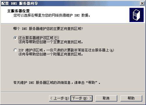 第2步,打开“主服务器位置”向导页,如果所部署的DNS服务器是网络中的第一台DNS服务器,则应该保持“这台服务器维护该区域”单选框的选中状态,将该DNS服务器作为主DNS服务器使用,并单击“下一步”按钮(如图4)。