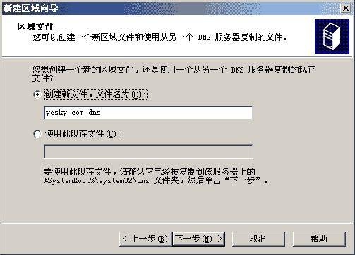 第4步,在打开的“区域文件”向导页中已经根据区域名称默认填入了一个文件名。该文件是一个ASCII文本文件,里面保存着该区域的信息,默认情况下保存在“windowssystem32dns”文件夹中。保持默认值不变,单击“下一步”按钮(如图6)。