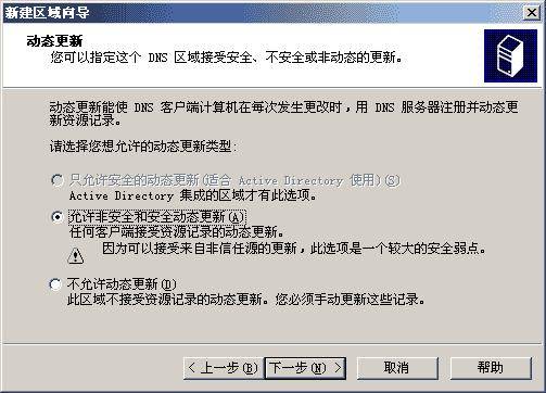 第5步,在打开的“动态更新”向导页中指定该DNS区域能够接受的注册信息更新类型。允许动态更新可以让系统自动地在DNS中注册有关信息,在实际应用中比较有用,因此点选“允许非安全和安全动态更新”单选框,单击“下一步”按钮(如图7)。