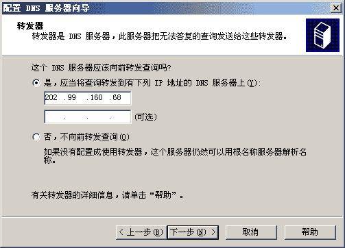 第6步,打开“转发器”向导页,保持“是,应当将查询转送到有下列IP地址的DNS服务器上”单选框的选中状态。在IP地址编辑框中键入ISP(或上级DNS服务器)提供的DNS服务器IP地址,单击“下一步”按钮(如图8)。