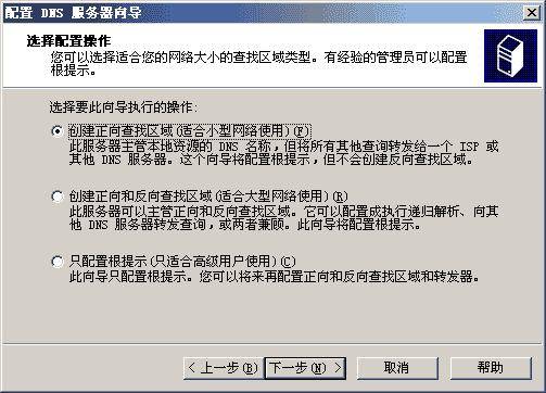 第1步,在“配置DNS服务器向导”的欢迎页面中单击“下一步”按钮,打开“选择配置操作”向导页。在默认情况下适合小型网络使用的“创建正向查找区域”单选框处于选中状态。而巴哥所管理的网络就不太大,因此保持默认选项并单击“下一步”按钮(如图3)。