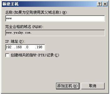 利用向导成功创建了“yesky.com”区域,可是内部用户还不能使用这个名称来访问内部站点,因为它还不是一个合格的域名。接着还需要在其基础上创建指向不同主机的域名才能提供域名解析服务。例如创建一个用以访问Web站点的域名“www.yesky.com”,具体操作步骤如下: