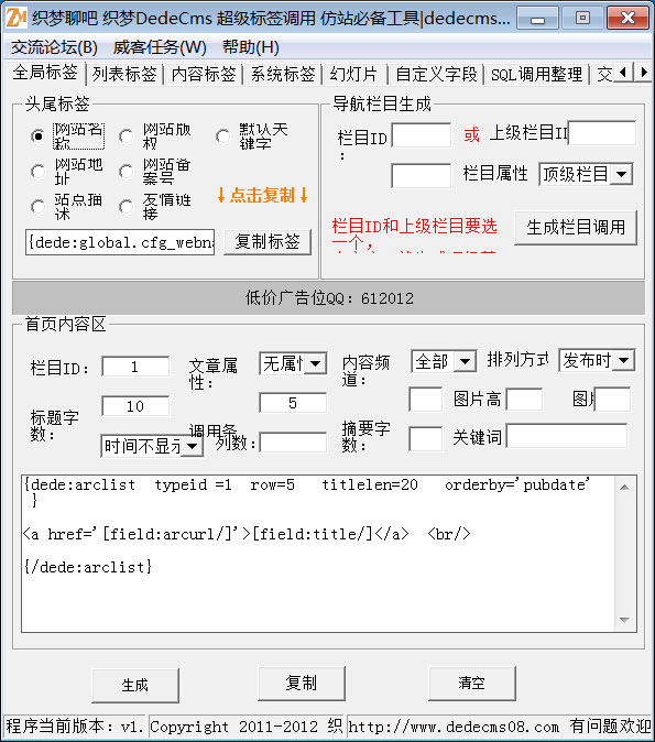 dedecms超级仿站标签,dedecms标签生成 来源:未知 作者: 文件类型:exe 大小:3MB 点击次数: 发布时间:2015-08-03 13:03:07 去下载 资源介绍 dedecms超级仿站标签生成器,只需要简单的勾选即可自动生成所需要的标签。对于菜鸟来说,简直可以对织梦一窍不通,也可以套站。它的功能大致分为:“全局标签”、“列表标签”、“内容标签”、“系统标签”、“幻灯片”、“自定义字段”、“SQL调用整理”。而且本工具还包括威客任务等等。本软件的版权归dedecms08。 使用方法 使用非常简单,首先勾选需要的生成的标签,或者填写相关参数,点击下面的生成按钮,即可生成对应的标签。 TAGS: dedecms超级仿站标签 下载 上一篇: IEtester-v0.5.4和debugbar-v7.5.1打包下载 下一篇: swf转视频软件:Moyea SWF to Video Converter Pro