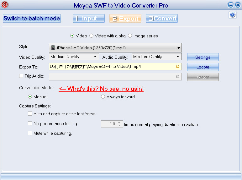 网上各种视频转换软件多如牛毛。今天,网页模板需要找一款能够将swf转换成视频的软件,可是找了很久,都没有找到,都不支持将swf转换成视频。因为swf转视频,和视频格式互转本质上不同,swf不是视频,是动画,而无论其他什么格式的视频,都是视频。但是,功夫不负有心人,我还是找到了一款能够将swf转换成视频的软件:Moyea SWF to Video Converter Pro。确切地说,并不是转换,因为swf不可能转成视频。它的原理是,将播放的swf录制成视频,质量基本上不损失。