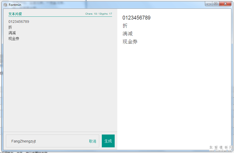 1、我们以“FangZhengzyjt.TTF”为例,字体大小为2.73M,其实我们只需要0-9,“折”、“满减”、“现金券”这几个字,截图如下: